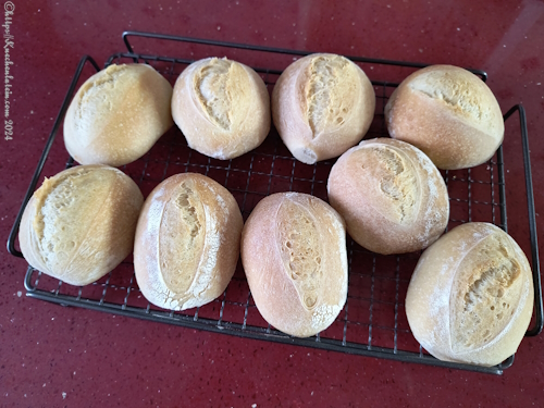 Hier gehen die bereits geformten Brötchen über Nacht im Kühlschrank und müssen morgens nur noch eingeschnitten und in den Backofen geschoben werden. Wohl dem, der einen programmierbaren Backofen hat, da ist die Backtemperatur schon zur Aufstehzeit erreicht. Im Gegensatz zu käuflich zu erwerbenden Aufbackbrötchen weiß ich bei selbstgebackenen was drin ist.